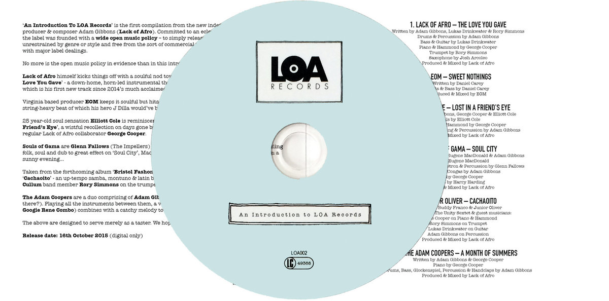‘An Introduction To LOA Records’ is the first compilation from the new independent label owned by producer & composer Adam Gibbons (Lack of Afro). Committed to an eclectic roster of diverse artists, the label was founded with a wide open music policy – to simply release quality music, completely unrestrained by genre or style and free from the sort of commercial pressures that can be associated with major label dealings.